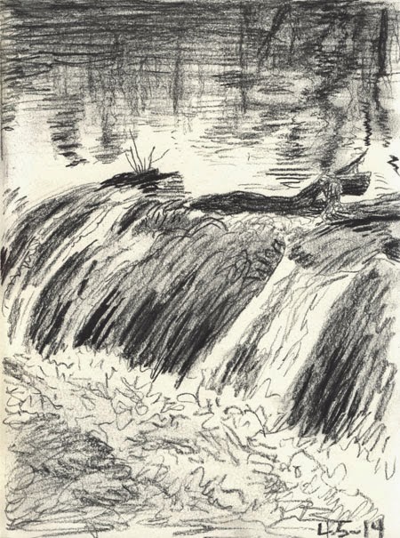 The river level has risen a bit more. The grassy park is flooded and the water laps here the way it would at the shore. The water in the river however, makes a familiar rushing sound. I take the watery white noise for granted but there is a little something extra today. |